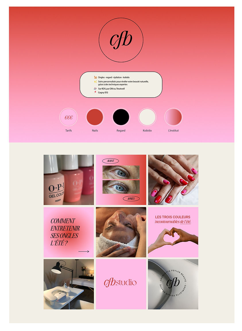 CFB-Studio est un espace d’esthétique moderne proposant des soins Kobido, ongles, regard et épilation. En cassant les codes traditionnels, le studio offre une expérience unique, portée par une identité visuelle audacieuse et élégante, loin des clichés habituels.