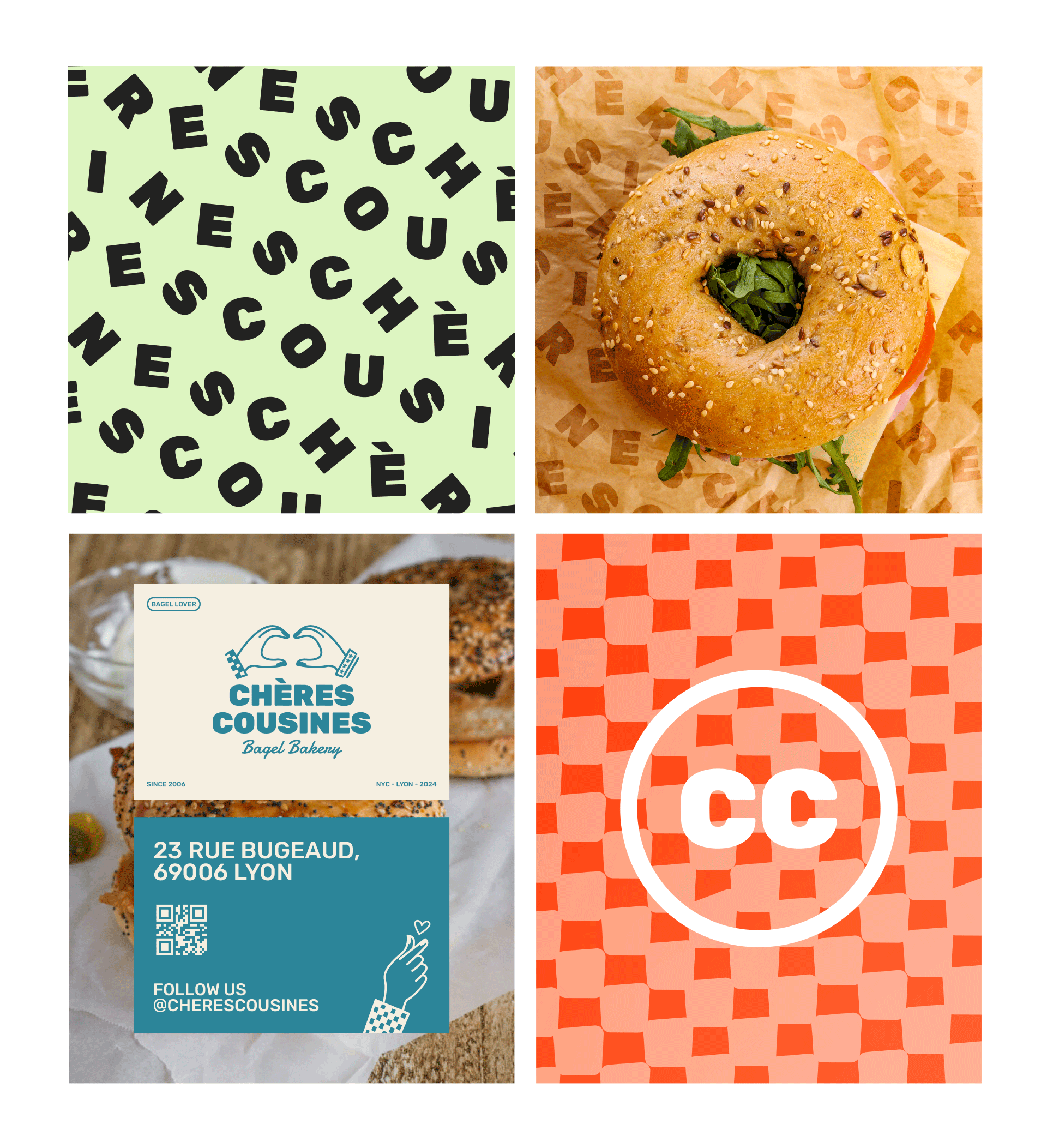 Chères cousines est un restaurant de bagels emblématique à Lyon. Repris par Grégoire et sa famille, ils m’ont demandé de refaire toute l’identité visuelle de celui-ci pour une ré-ouverture. C’est un restaurant français qui propose des recettes de bagels en proposant des produits locaux tout en respectant les recettes américaines.